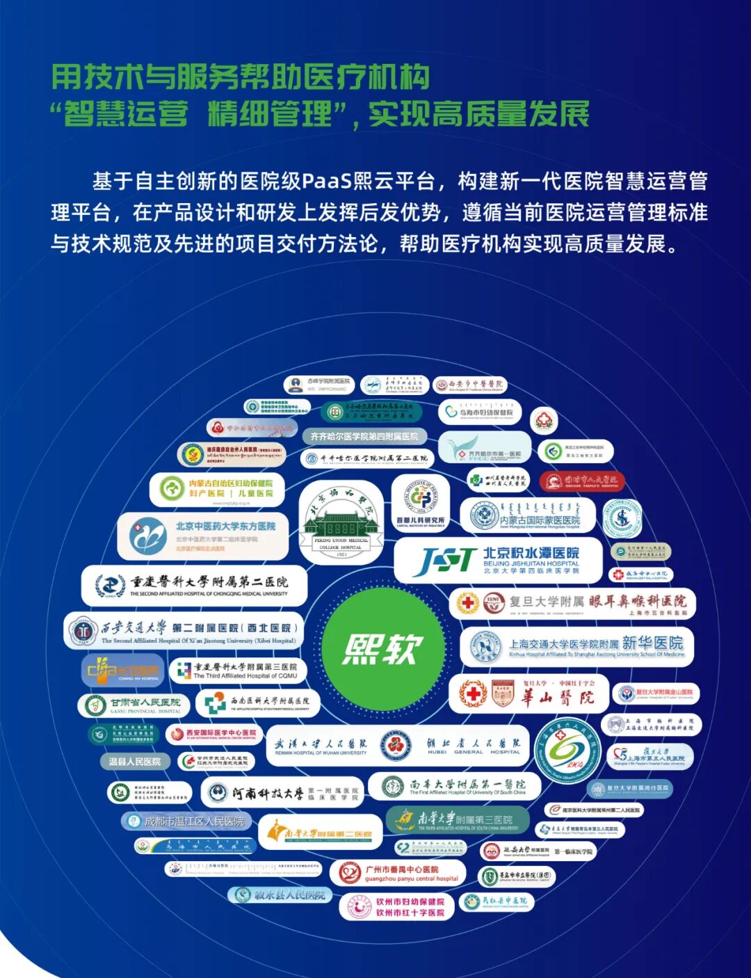 基于自主创新的熙云平台,构建新一代医院智慧运营平台,在产品设计和研发上发挥后发优势,遵循新时代医院运营管理标准与规范及先进的项目交付服务方法论,在数字化时代帮助医疗机构实现高质量发展。截至目前,熙软科技已为超过200多家委属、省级医院、三级医院和县级医院、医共体提供数智化服务,助力公立医院实现精细管理,高质量发展。